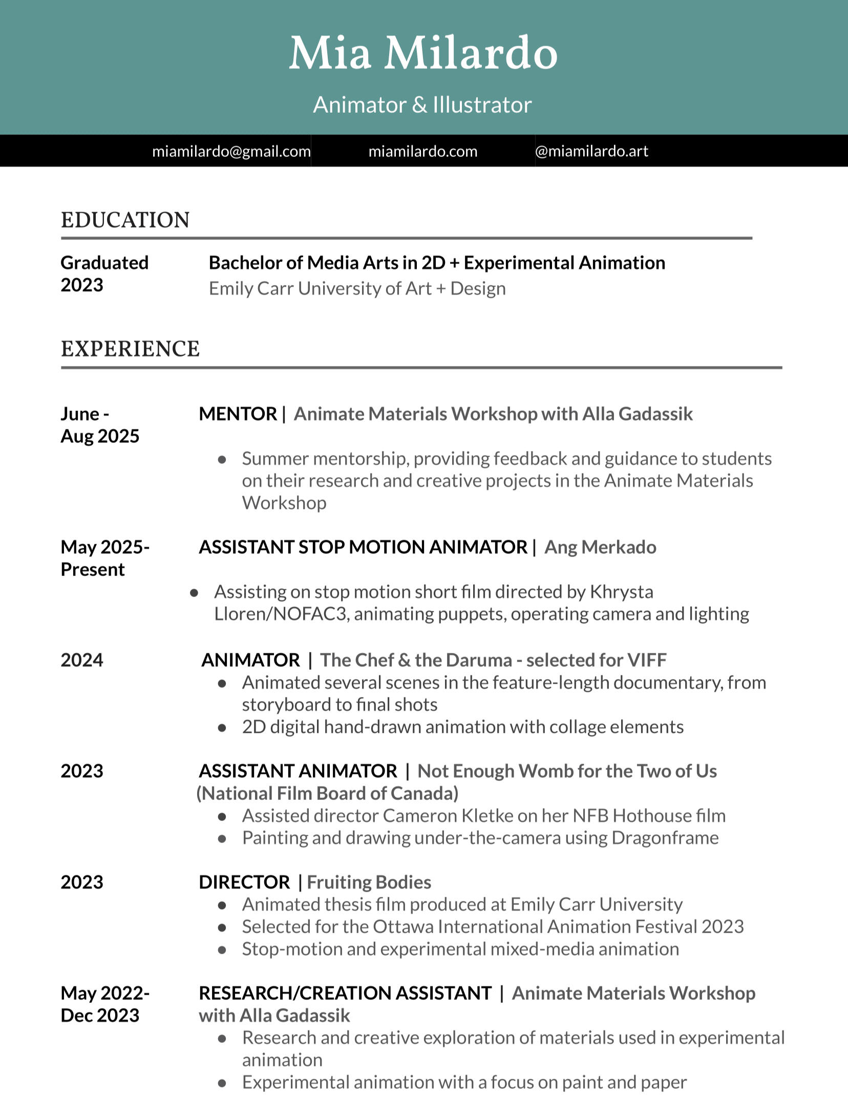 Mia Milardo is a Vancouver-based Canadian animator and illustrator. She studied 2D + Experimental Animation at Emily Carr University of Art + Design, with special interests in stop motion and experimental methods.She enjoys a mixed-media approach to art, always experimenting with intriguing materials to create handmade and tactile aesthetics. Mia’s student film Fruiting Bodies has been shown at film festivals worldwide such as the Ottawa International Animation Festival, and she recently worked on the feature documentary The Chef & the Daruma creating hand-drawn animated scenes with collage elements.